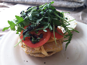 Everything bagel sandwich with tempeh, arugula, tomato,
